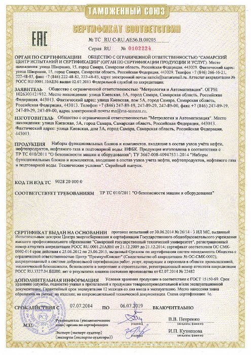Всё оборудование и средства измерений, входящие в состав СИКН(C), имеют действующие сертификаты соответствия Госстандарта РФ, сертификаты Ростехнадзора.
